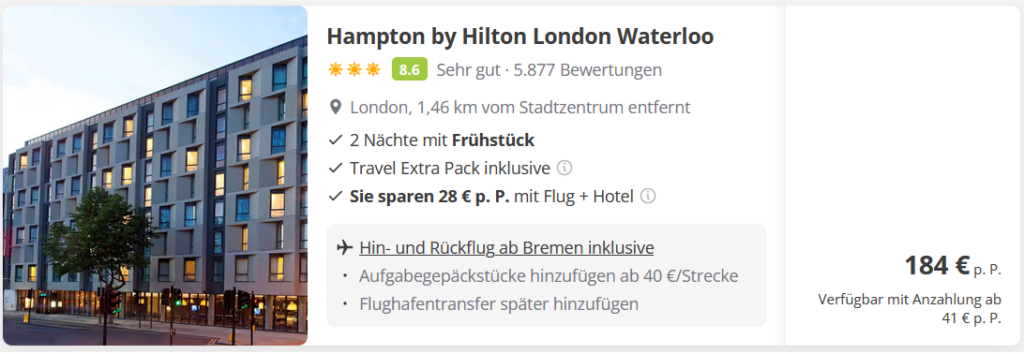 Aktuell haben wir ein echtes Preis-Highlight entdeckt: Im Hampton by Hilton London Waterloo übernachtet ihr zu absoluten Bestpreisen. Inklusive Flug und Frühstück bekommt ihr 2 Nächte schon ab 185 € pro Person. Dazu punktet das Hotel mit einer erstklassigen Lage direkt im Herzen von Waterloo – viele der bekanntesten Sehenswürdigkeiten erreicht ihr bequem zu Fuß und in kurzer Zeit. Zimmerupgrades sind ab 9 Euro p. P. ebenso verfügbar wie weitere Zimmerkategorien.